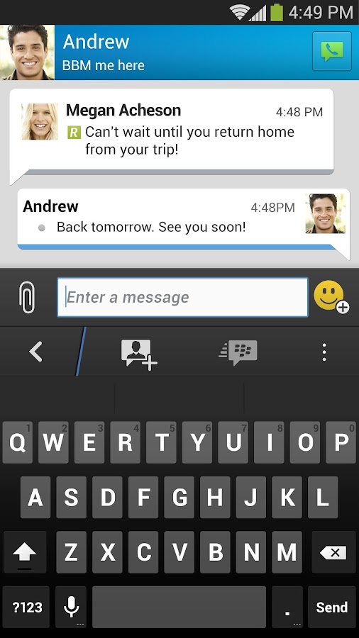 BBM menyatukan Anda bersama teman dan keluarga melalui obrolan instan, panggilan suara, berbagi gambar, catatan suara, dan lainnya. Unduh versi resmi BBM dari BlackBerry sekarang.Mengobrol dengan teman di Android, BlackBerry, dan iPhone:
